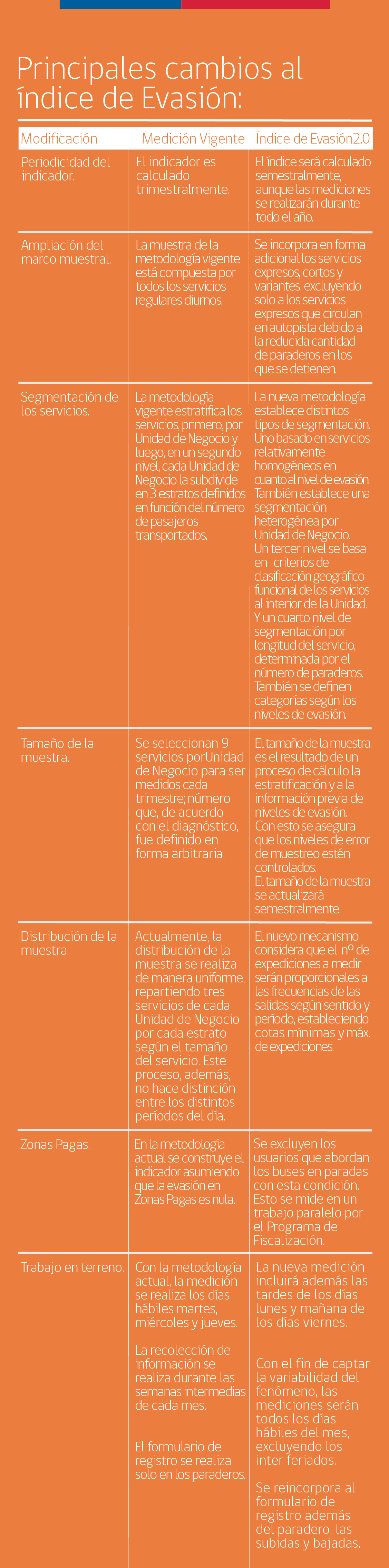 Entre los principales beneficios que traerá esta nueva metodología se destaca que el indicador tendrá mayor representatividad a distintos niveles ya que se ampliará el marco muestral de la medición, incorporando más servicios, más días de fiscalización y una distribución de la muestra por servicio-sentido-período garantizar representatividad horaria y focalizar las medidas en diferentes horas del día. También se elaborará una cifra general del sistema, incluyendo las mediciones de Metro y Tren Central y se obtendrá una radiografía cifra de evasión por unidad de servicios con márgenes de error controlados.