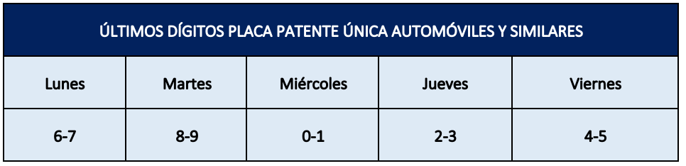 Considerando la pandemia de Covid-19 que afecta al país, en esta oportunidad, se dispuso una excepción para los vehículos de uso particular del personal de la salud que se desempeñe en establecimientos públicos o privados, y que cuenten con servicios de urgencia. La solicitud deberá ser realizada por el establecimiento de salud respectivo, indicando los datos de los vehículos y acompañando su documentación en la página web www.mtt.gob.cl o al correo electrónico ofiparteseremitrm@mtt.gob.cl