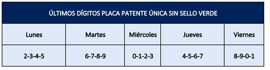 Además, fuera de dicho perímetro, pero dentro de la provincia de Santiago y las comunas de San Bernardo y Puente Alto, estos vehículos tendrán restricción de circular de lunes a viernes, excepto festivos, entre las 7.30 y 21:00 hrs., según la siguiente tabla: