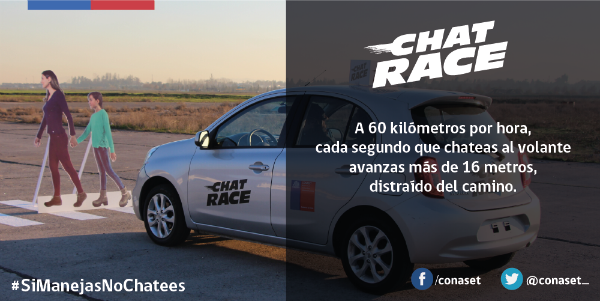 El objetivo de esta nueva campaña presentada por el Ministerio de Transportes y Telecomunicaciones, es cómo la distracción al volante afecta la velocidad de reacción. Es por ello, que se realizó un experimento llamado “Chat Race” que contó con la participación del brasileño Marcel Fernandes Filho, Récord Guinness de escritura de mensajes de texto en celular.