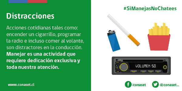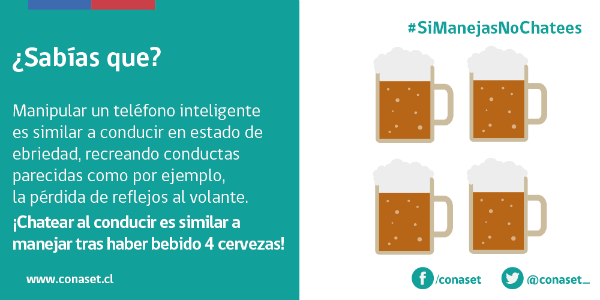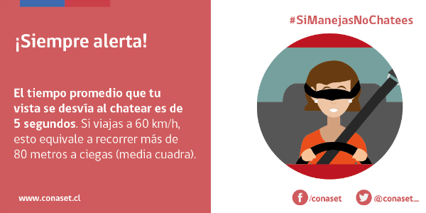 “Cada segundo que chatees al volante avanzas más de 16 metros”, señaló la ministra de Transportes y Telecomunicaciones, Paola Tapia, en el marco del lanzamiento de la campaña de seguridad vial #SiManejasNoChatees -elaborada por CONASET- que busca generar conciencia entre los conductores y llama a dejar el teléfono celular a un lado mientras se encuentran tras el volante.